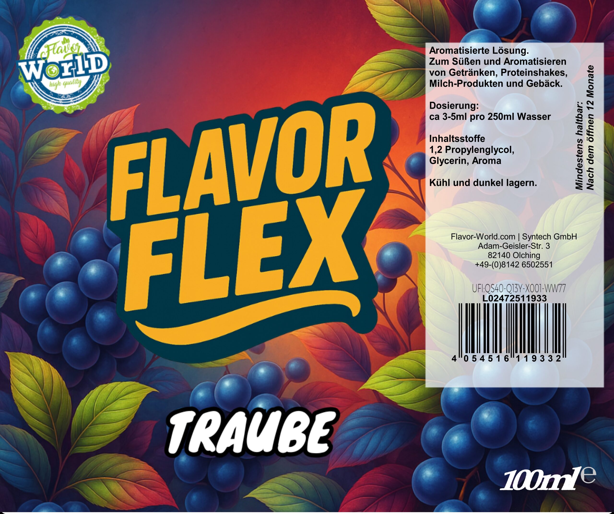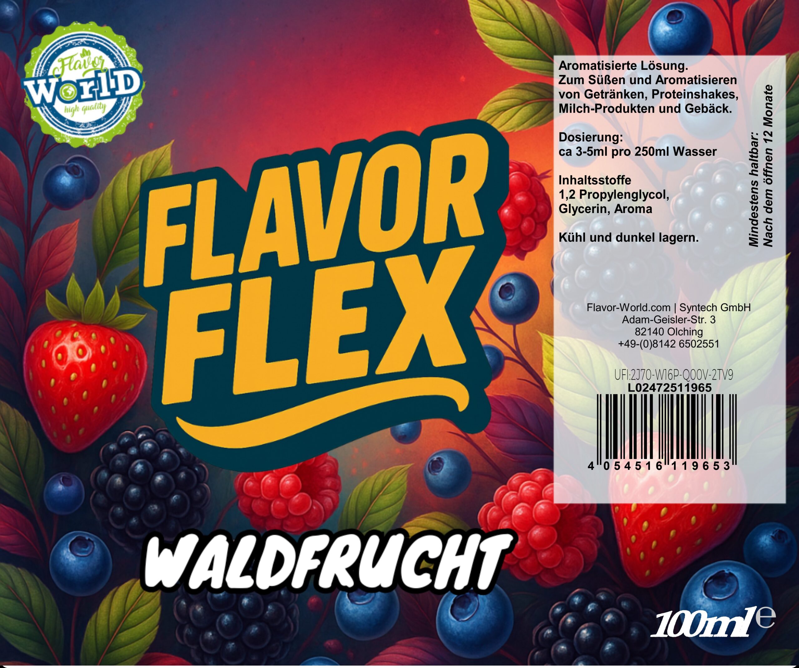Flavor Flex sind hochwertige, lebensmitteltaugliche Aromakonzentrate in 80 ml oder 100 ml Tropfflaschen auf Basis von Propylenglykol (E1520) und pflanzlichem Glycerin (E422). Entwickelt, um Getränke, Proteinshakes, Desserts, Gebäck und vieles mehr schnell und einfach zu aromatisieren — ohne Zusatz von Zucker oder Kalorien in relevanter Menge (bei typischer Dosierung).