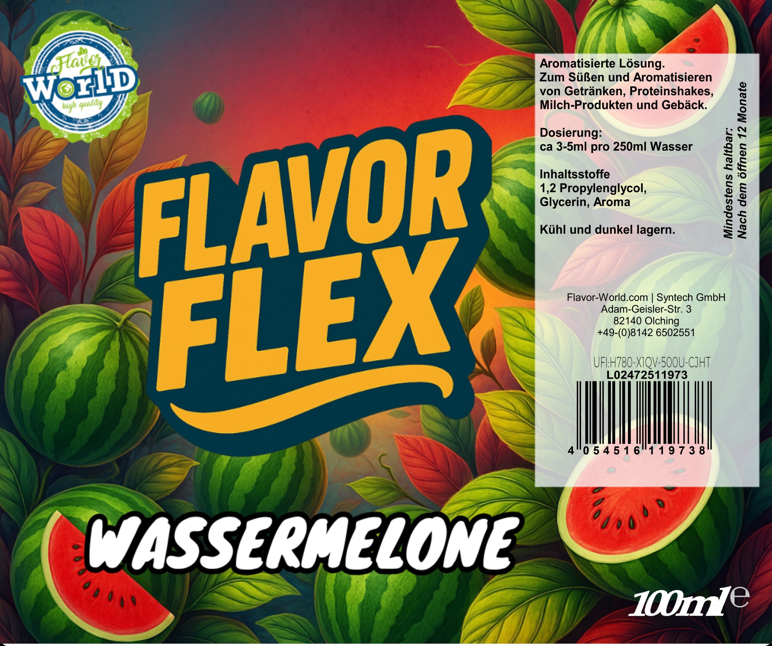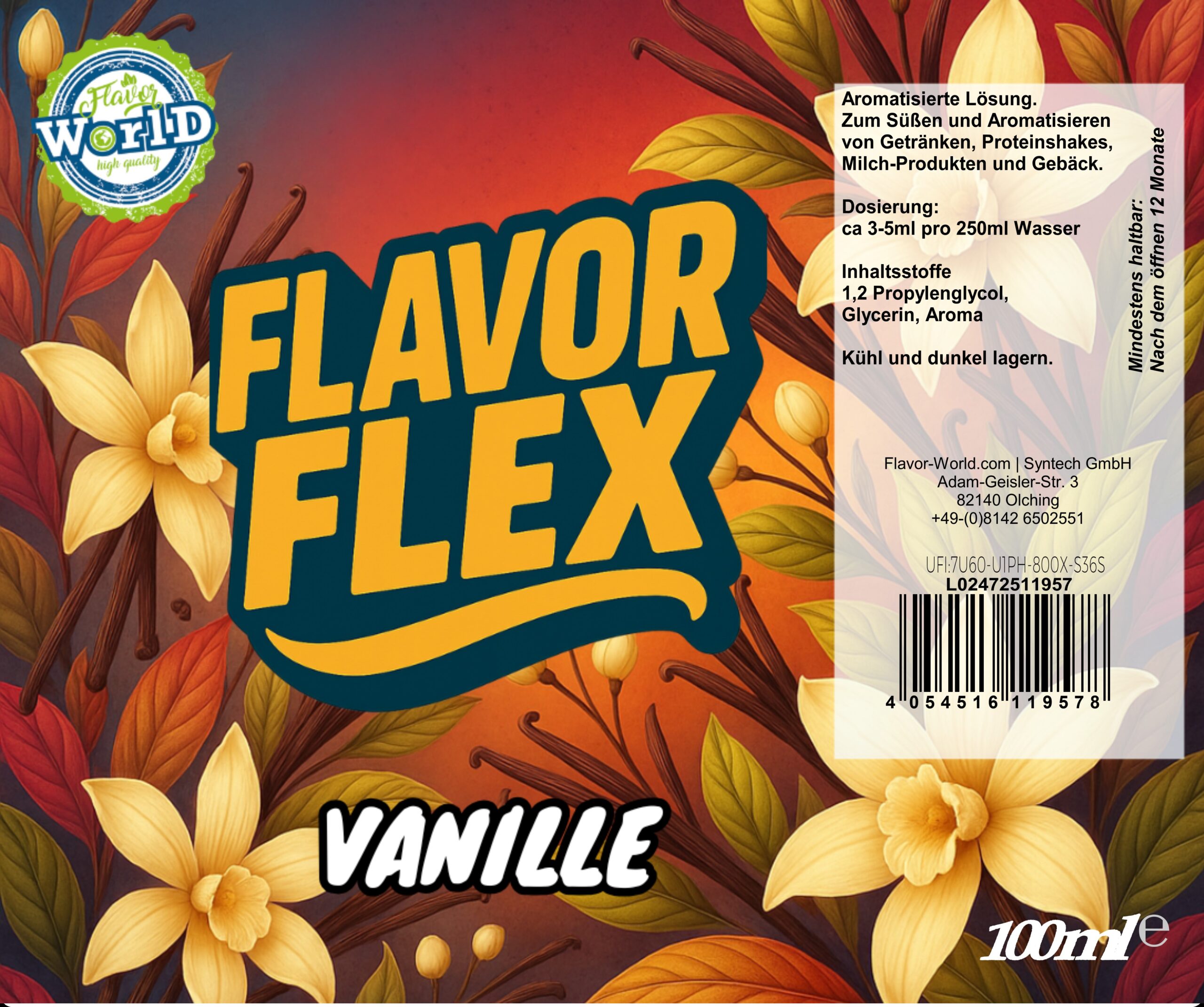 Flavor Flex Aromen sind Lebensmittel-Aromen und keine Arzneimittel. Für detaillierte technische Datenblätter (Sicherheitsdatenblatt, Inhaltsstoffe, Allergenhinweise auf Anfrage) kontaktieren Sie uns — wir stellen Ihnen gern die notwendigen Dokumente zur Verfügung.