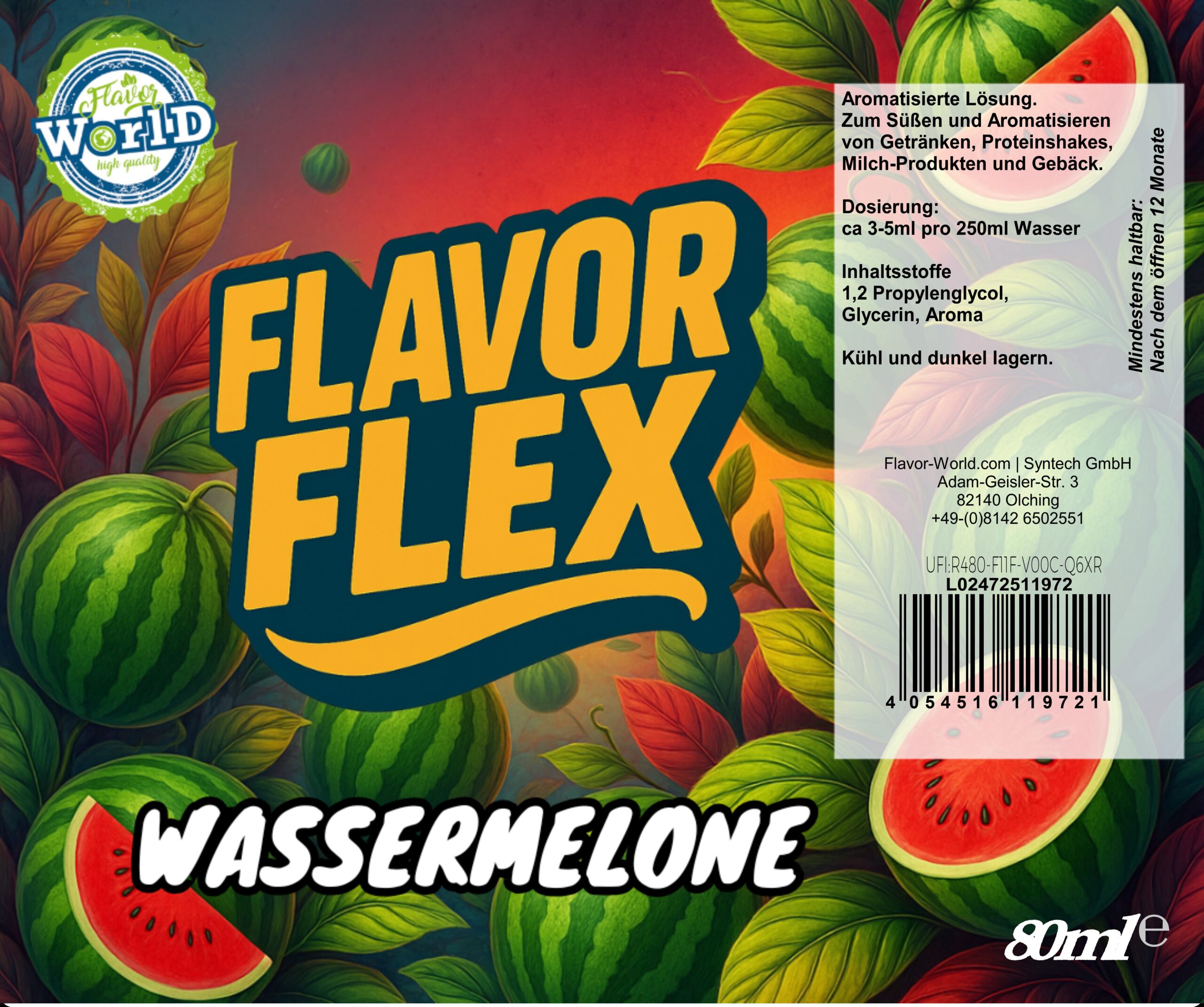 Flavor Flex sind hochwertige, lebensmitteltaugliche Aromakonzentrate in 80 ml oder 100 ml Tropfflaschen auf Basis von Propylenglykol (E1520) und pflanzlichem Glycerin (E422). Entwickelt, um Getränke, Proteinshakes, Desserts, Gebäck und vieles mehr schnell und einfach zu aromatisieren — ohne Zusatz von Zucker oder Kalorien in relevanter Menge (bei typischer Dosierung).